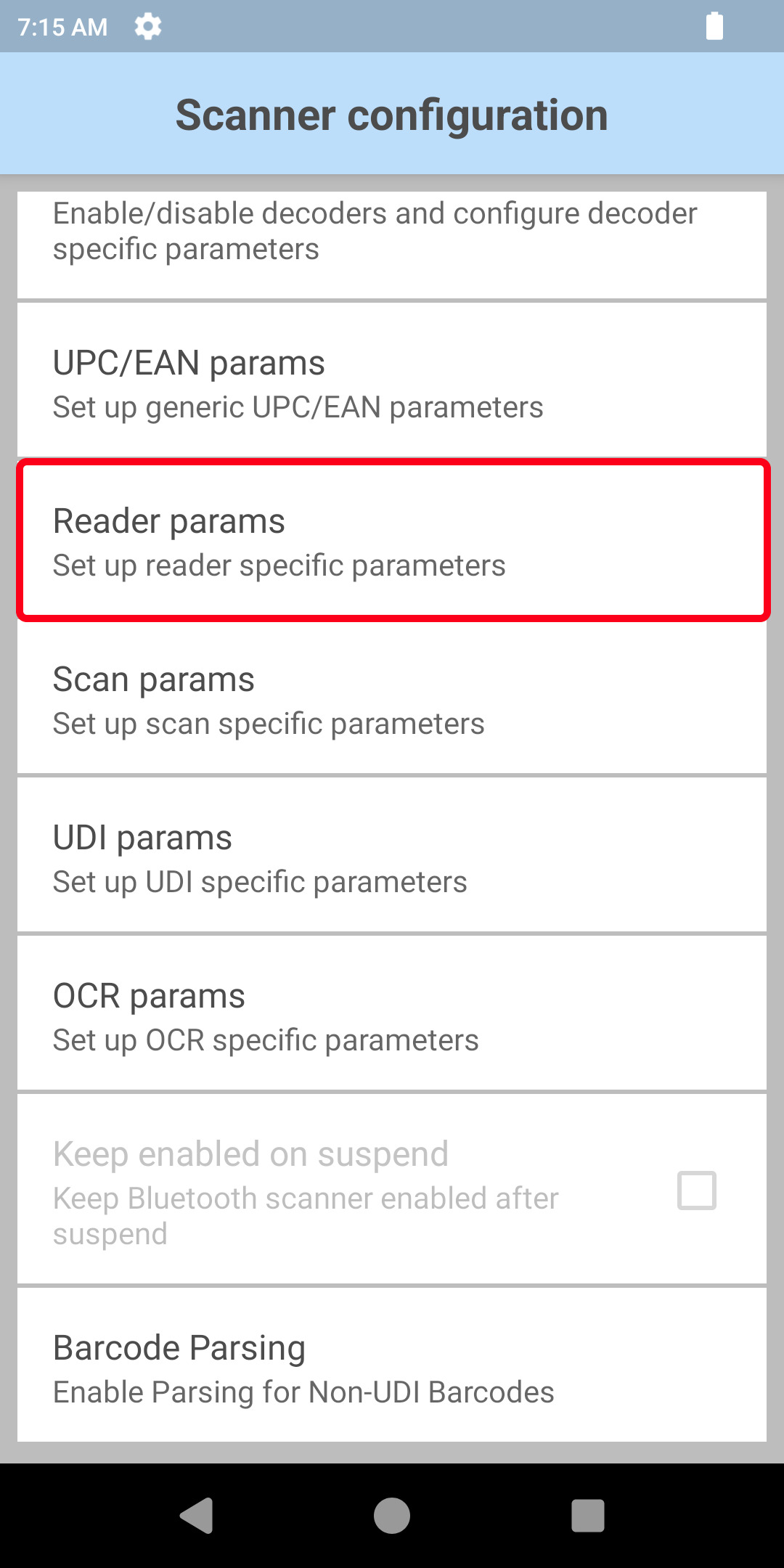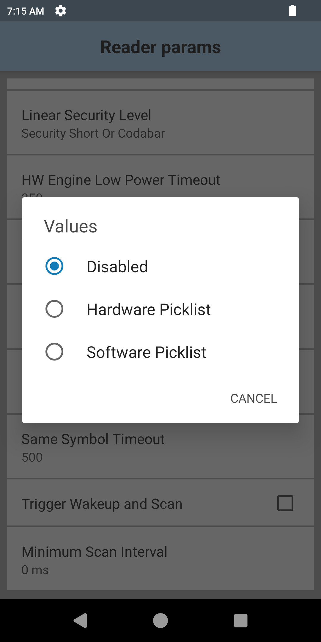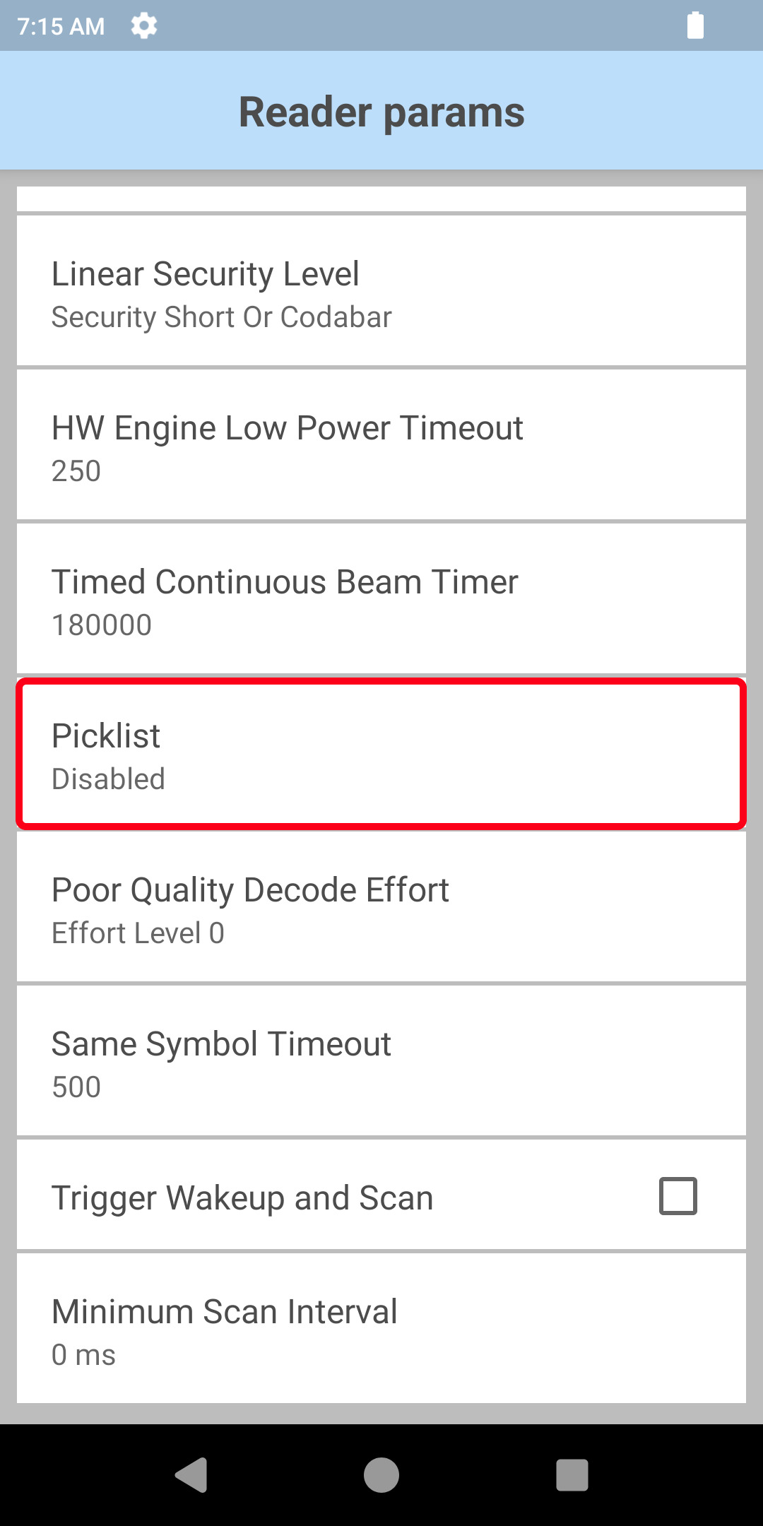 | Go to the “Reader params” menu. | Go to the “Picklist” menu. | Set your Picklist parameters |